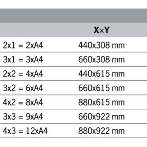 | Variation | 2×1 = 2xA4, 3×1 = 3xA4, 2×2 = 4xA4, 3×2 = 6xA4, 4×2 = 8xA4, 3×3 = 9xA4, 4×3 = 12xA4 |